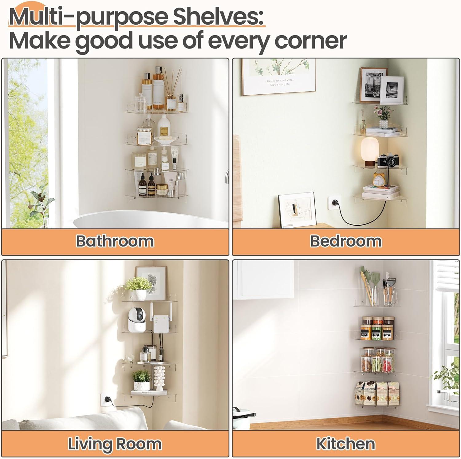 upsimples 4 Pack Acrylic Corner Floating Shelves, 12 in Clear Hanging Shelves with Cable Management Design, Wall Mounted Corner Storage Organizer for Bathroom, Bedroom, Living Room, Kitchen(12×16.7×2)