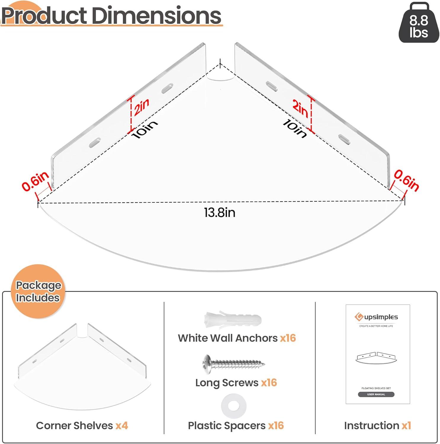 Be the first to review “upsimples 4 Pack Acrylic Corner Floating Shelves, 12 in Clear Hanging Shelves with Cable Management Design, Wall Mounted Corner Storage Organizer for Bathroom, Bedroom, Living Room, Kitchen(10×13.8×2 in)”